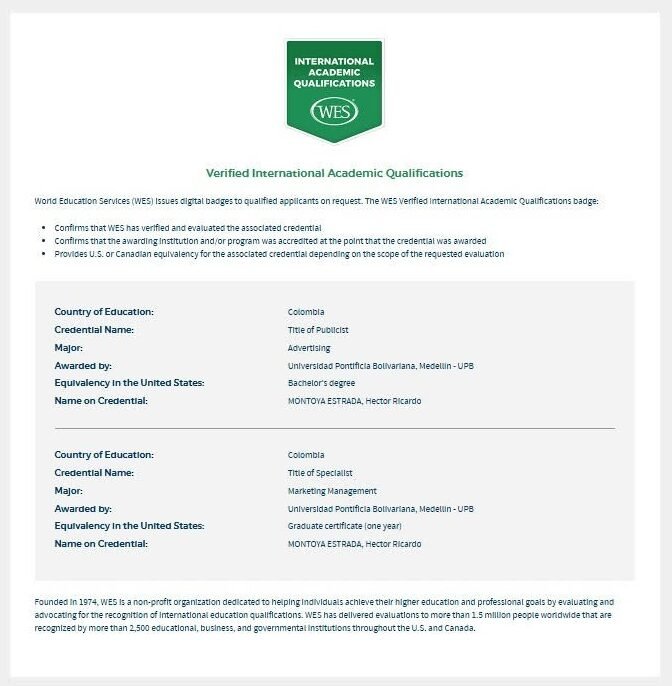 Bachelor of Arts in Advertising (WES U.S. Equivalency).